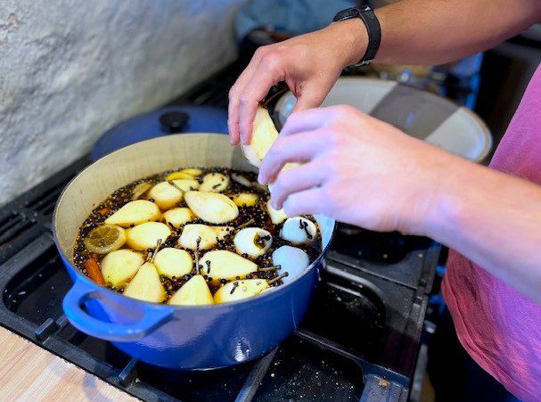 Even our own pear tree, which we had been told by neighbours would never produce much fruit as pear trees don’t grow well here, had more fruit than ever. David collected as many as possible and made some lovely poached pears to enjoy over the winter.