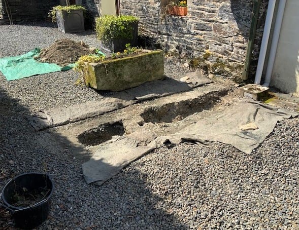 Lowering the level proved harder than I’d hoped as I struck what was evidently an old hard standing and path. We had been told that a building used to stand on the exact same spot at some time and evidently there was lots of compacted stone used around it – just above the level I needed to dig out to. Of course! You can just see the large stones which were a path at the bottom of this photo taken way back in 2016 when we were building the garage.