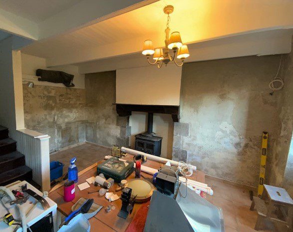 In our initial revamp in 2015, we saw that the render on the internal walls of the ground floor had had a number of patch repairs and, when tapping on them, there was a very hollow sound suggesting that the render was not well attached to the wall. In 2015 we didn’t have the time to resolve this and hoped that no one would knock the render too hard and cause it to come off!