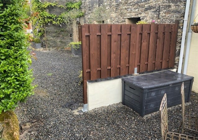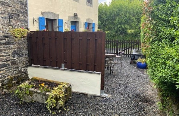 After a trip to Brest early in the week I did buy some appropriate brackets to erect the fence element of the new division between Granary and Priory in time for their guests to arrive. Sadly, I could not erect the new gate post as, when we tried to put it up we discovered a large block of concrete which was evidently the base of a previous fence in exactly the spot we wanted to use. You can just see it next to the hedge in these pictures. A(nother) job for next week.