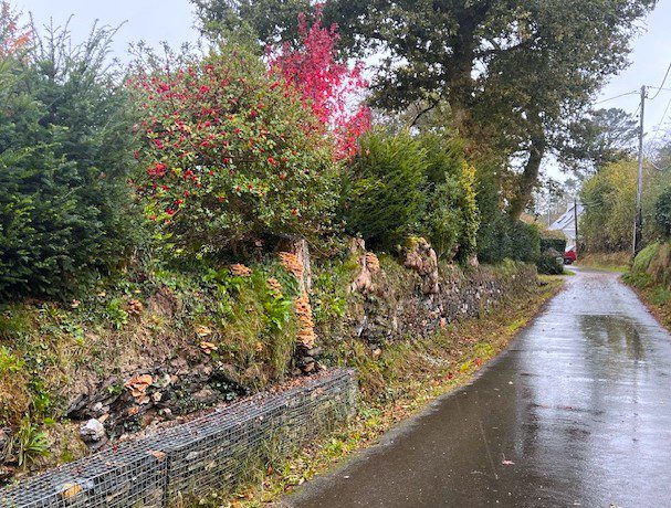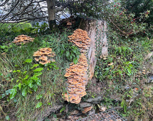 I try and keep control of the weeds growing out of the talus both because it looks better but also because as the roots expand, principally the bramble roots, they dislodge some of the slates and destabilise the wall.  Having done that we have seen the re-emergence of amazing fungi on the dead stumps.  While interesting and quite attractive, we think this is the dreaded honey fungus that is killing all our privet, and potentially one of our liquidambar trees.