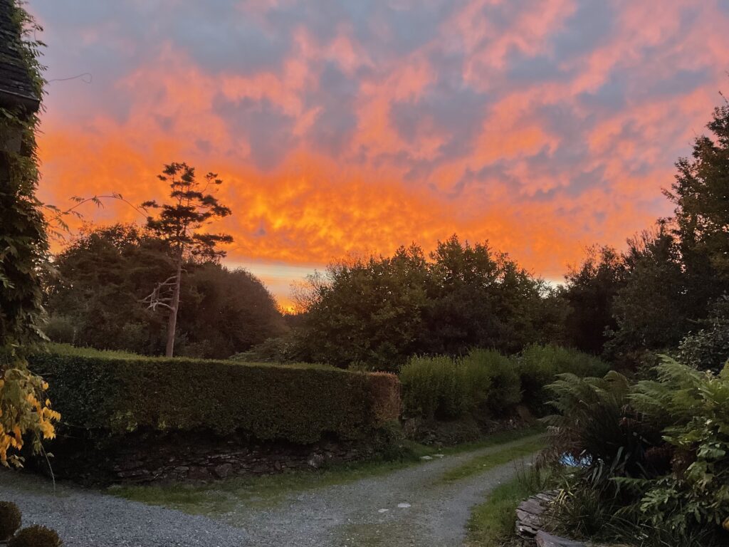 A change had to come at some point and was widely forecast to be overnight last night.  The first indication was an amazing red sky shortly after sunrise yesterday that lit up over the Monts D’Arrée.  This morning was grey, blustery and with the promised, and to some degree much-needed, rain.