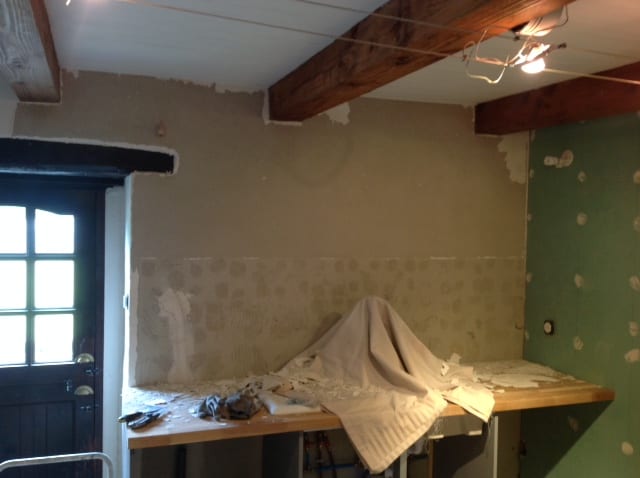 The last task listed became the classic ‘one job leads to another’ scenario as, having installed the sink and work top, I saw a small area of loose paint above which started to scrape off. The walls are rendered on the inside and it looks like they had then been painted with regular emulsion, which evidently hadn’t adhered too well so, having started to peel some off, it led to me having to strip a far larger area of wall than I’d anticipated.