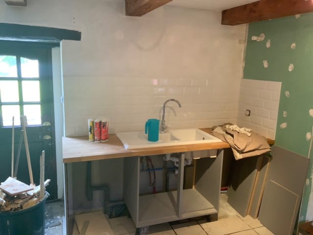 I have been working throughout and, as the plumber finished in various areas I was able to do the finishing tasks or whatever was required for the next bit. This has included boxing in the new chauffe-eau and starting to box in the pipework; tiling the en-suite shower so he could install the taps, and installing the kitchen sink so the taps could be fitted.