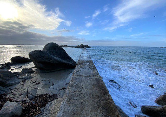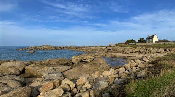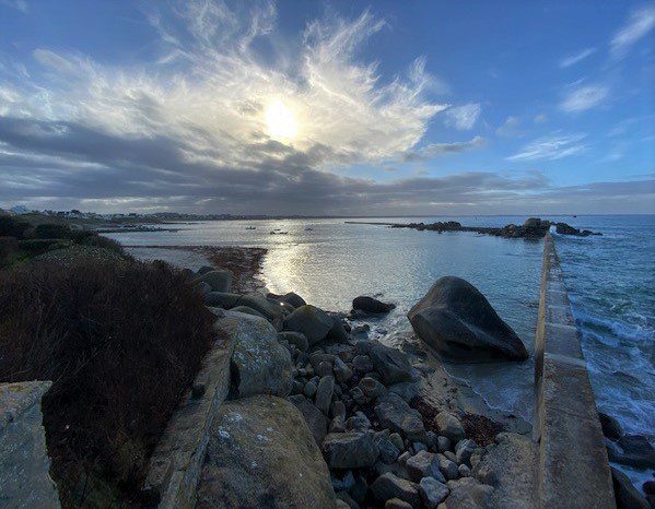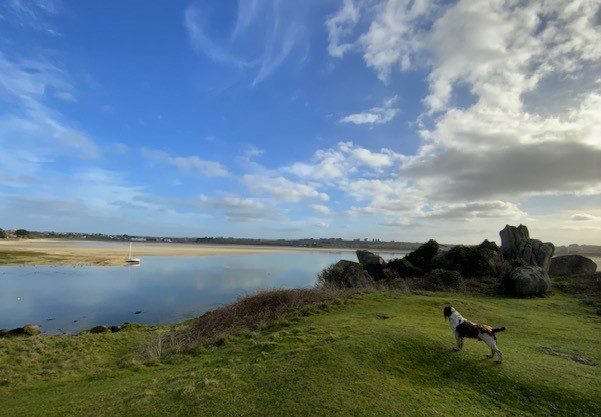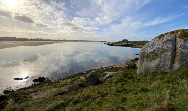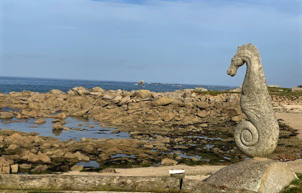 Today we headed back to the north coast but slightly east of last week’s walk. This afternoon we started in the hamlet of Porz Ar Stréat next to a sculpture of a seahorse, and did a 9.2 km circular route that tool us along the banks of the Bay of Kernic, a large, shallow, tidal lake to the west of Plouescat. Very picturesque.